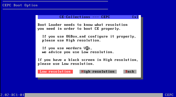 - for VMware VBox Qemu or other modern VMs, you can only use the Low Resolution mode.